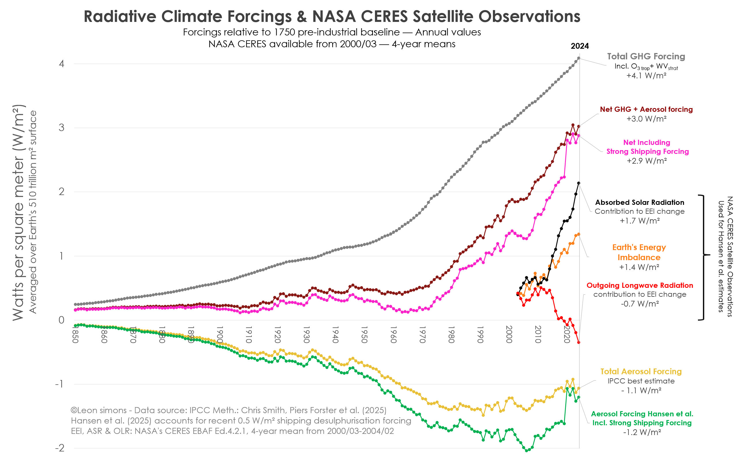 The final two graphs show combined forcing of greenhouse gases and aerosols relative to 2010, when according to the IPCC methodology was +2.2 W/m² above 1750 (before the start of industrial revolution).
